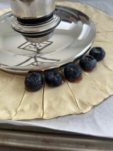 - Dip each bottom of each blueberry into the raspberry jam. Cut consecutives lines in between each placed blueberry.