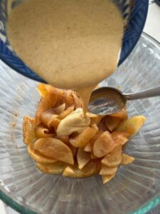 - In a medium size skillet place sliced apples over medium-high heat. When they start releasing some juices add sugar, stir and add ground cinnamon, pumpkin spice and brown sugar. Pre-heat oven to 389 grades Farenheit.